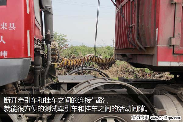 那應(yīng)該怎樣判斷是它們之間間隙大了呢?其實(shí)也很容易,具體操作方法:拉住掛車(chē)手剎(沒(méi)有的車(chē)型可以把牽引車(chē)和掛車(chē)之間的氣路連接斷開(kāi)),讓掛車(chē)緊急制動(dòng)停在原地。