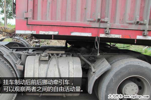 兩人配合,一個(gè)人駕駛牽引車(chē)向前、向后反復(fù)活動(dòng)幾次,另一個(gè)人在旁邊觀察牽引盤(pán)和掛車(chē)是否有相對(duì)的間隙,如果有很容易就能觀察的到。
