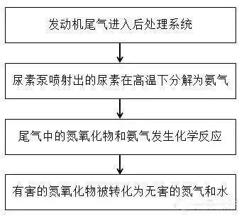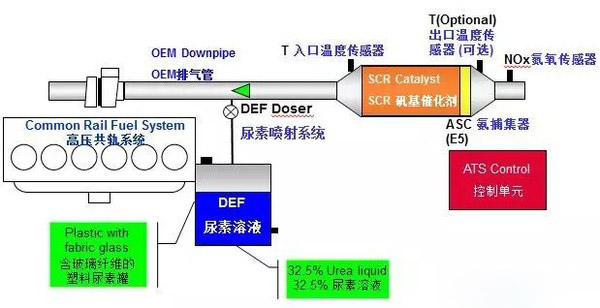 當(dāng)共軌系統(tǒng)噴射到燃燒室燃燒后產(chǎn)生的廢氣進(jìn)入排氣系統(tǒng),SCR利用尿素噴射系統(tǒng)將尿素水溶液噴入排氣系統(tǒng),在廢氣流中分解為氨氣并在催化劑的作用下與氮氧化物發(fā)生反應(yīng),使之轉(zhuǎn)化為無(wú)害的氮?dú)夂退。系統(tǒng)還在尾氣排放前用氮氧化物傳感器檢測(cè)尾氣是否達(dá)到排放標(biāo)準(zhǔn)。由于SCR技術(shù)需要更高的發(fā)動(dòng)機(jī)燃燒溫度,需在催化器前使用溫度傳感器。