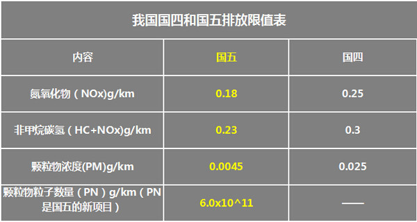 國(guó)五排放標(biāo)準(zhǔn)相比國(guó)四排放標(biāo)準(zhǔn),氮氧化物(NOx)排放降低了28%,碳?xì)浠衔锖偷趸铮℉C+NOx)總和指標(biāo)降低了23%,而對(duì)于柴油車的顆粒物濃度(PM)降低了82%,還有新增的顆粒物粒子數(shù)量(PN)檢測(cè)也是沖著柴油車來(lái)的,PN標(biāo)準(zhǔn)只對(duì)柴油車檢測(cè)。