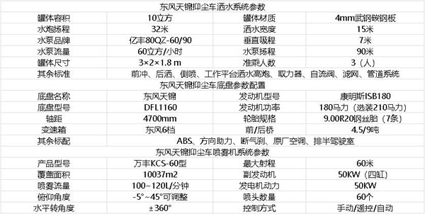 東風天錦抑塵車罐體容積10方,罐體材質為4mm厚武鋼優(yōu)質板材,億豐品牌灑水泵(帶自吸自排功能),配套萬豐品牌噴霧機組,配置如下: