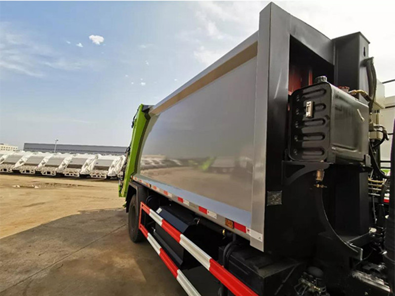 1、產(chǎn)品結(jié)構(gòu)介紹A、箱體結(jié)構(gòu)  垃圾箱采用加強(qiáng)梁和高強(qiáng)度鋼板焊接而成牢固的框架結(jié)構(gòu),側(cè)面采用縱向無拼焊工藝的整板制作,側(cè)板上下加強(qiáng)梁與側(cè)板整體成型,采用專用設(shè)備冷彎成型,大R角成型,提高了剛性,側(cè)板縱向無焊縫,有效避免了傳統(tǒng)拼焊工藝長(zhǎng)時(shí)間使用造成的焊縫疲勞失效等缺陷,頂面為圓弧曲面,箱體底板與箱體側(cè)板采用先進(jìn)的拼焊工藝,避免了傳統(tǒng)焊接工藝長(zhǎng)期使用造成箱體漏水的現(xiàn)象,箱體前下部設(shè)置有大容量污水收集箱,提高了車輛污水儲(chǔ)存能力,整體箱體外形美觀,重量輕,受力好,不易變形。