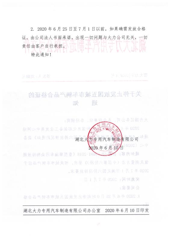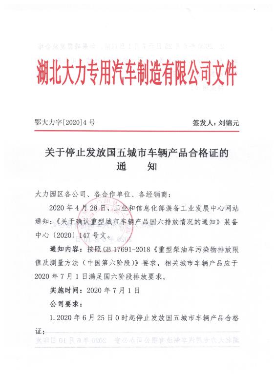 2020年4月29日工業(yè)和信息化部裝備工業(yè)發(fā)展中心下發(fā)的【2020】147號(hào)文件關(guān)于確認(rèn)重型城市車輛產(chǎn)品國六排放情況的通知,根據(jù)實(shí)際情況湖北大力專用汽車制造有限公司下發(fā)關(guān)于停止發(fā)放國五城市車輛產(chǎn)品合格證的通知。