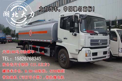 車輛配置 采用東風(fēng)集團(tuán)原裝底盤生產(chǎn),排半可前翻駕駛室,大同6檔變速箱,4.5噸前橋9噸后橋,采用9.00-20尼龍?zhí)ヌゲ捎?50×80MM直通車架,配置康明斯190馬力發(fā)動機(jī),發(fā)動機(jī)型號:B190 33. 豪華駕駛室,斷氣剎/排氣制動/動力轉(zhuǎn)向.配備標(biāo)準(zhǔn)加油機(jī)一臺,帶15米卷盤和槍,配置專用油泵,具有快速的進(jìn)油或出油功能。隨車附帶2根罐體等長的油管,2個滅火器,1個爬梯,兩側(cè)及后保險杠,1根接地線。罐體最大容積17.5立方米(15噸柴油)。