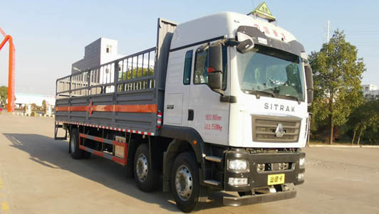 該車為危險品運(yùn)輸車.隨底盤選裝駕駛室.運(yùn)輸獨(dú)立容器(瓶)包裝的氣體氣瓶.類項號:2.1,2.2.選掛2.1類易燃?xì)怏w警示牌或2.2類非易燃無毒氣體警示牌,選裝無柵欄樣式,選裝后部樣式.后部安裝液壓尾板,液壓尾板收起水平長度:300mm,尾板質(zhì)量為550kg.側(cè)、后防護(hù)材料為Q235,連接方式:焊接連接,后防護(hù)截面高120mm,截面寬50mm,下邊緣離地高490mm.選裝后部不帶尾板時,后防護(hù)裝置材料:Q235,連接方式為焊接連接,后防護(hù)截面高120mm,截面寬50mm,下邊緣離地高490mm.僅采用排氣管前置,子午胎,限速裝置,輔助制動裝置和前盤制動器的底盤;限速80km/h.安裝具有衛(wèi)星定位功能的行駛記錄儀.EBS生產(chǎn)廠家/型號:克諾爾制動系統(tǒng)(大連)有限公司/EBS 5.發(fā)動機(jī)CA6DLD-22E6對應(yīng)的油耗值為(L/100km):26.53.后軸僅采用空氣懸架,轉(zhuǎn)向軸已安裝防爆胎裝置.選裝ETC車載裝置.整車長/前懸/軸距/后懸(mm)對應(yīng)關(guān)系為8610/1332/4700/2578,9000/1332/5250/2418.